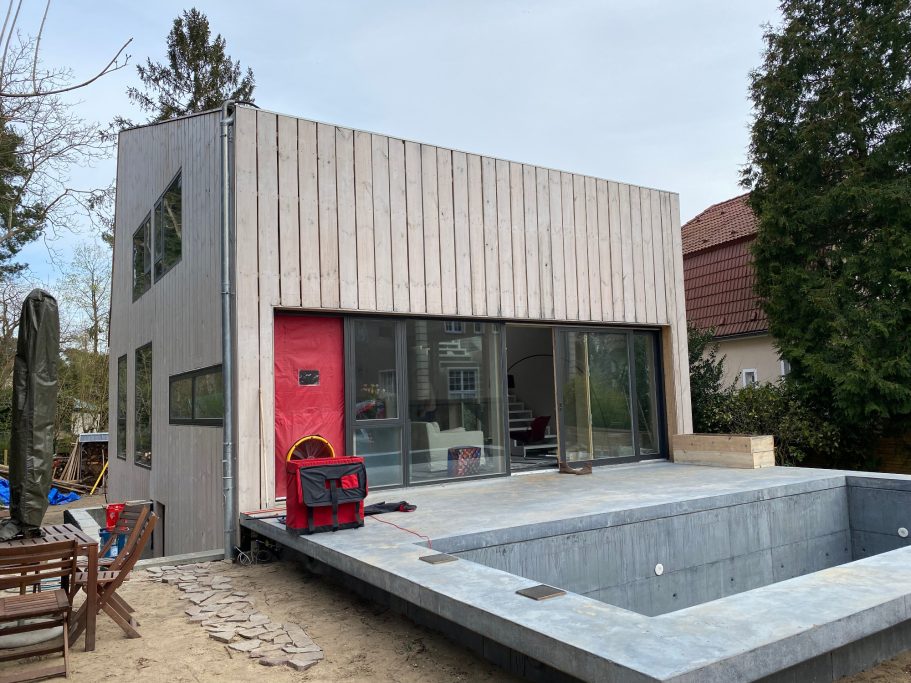 Neubau eines modernen Einfamilienhauses in nachhaltiger Holzbauweise mit ökologischen Materialien, optimiert für Solarenergie. Ausgestattet mit Wärmepumpe und Speichersystem, im Effizienzhausstandard realisiert.